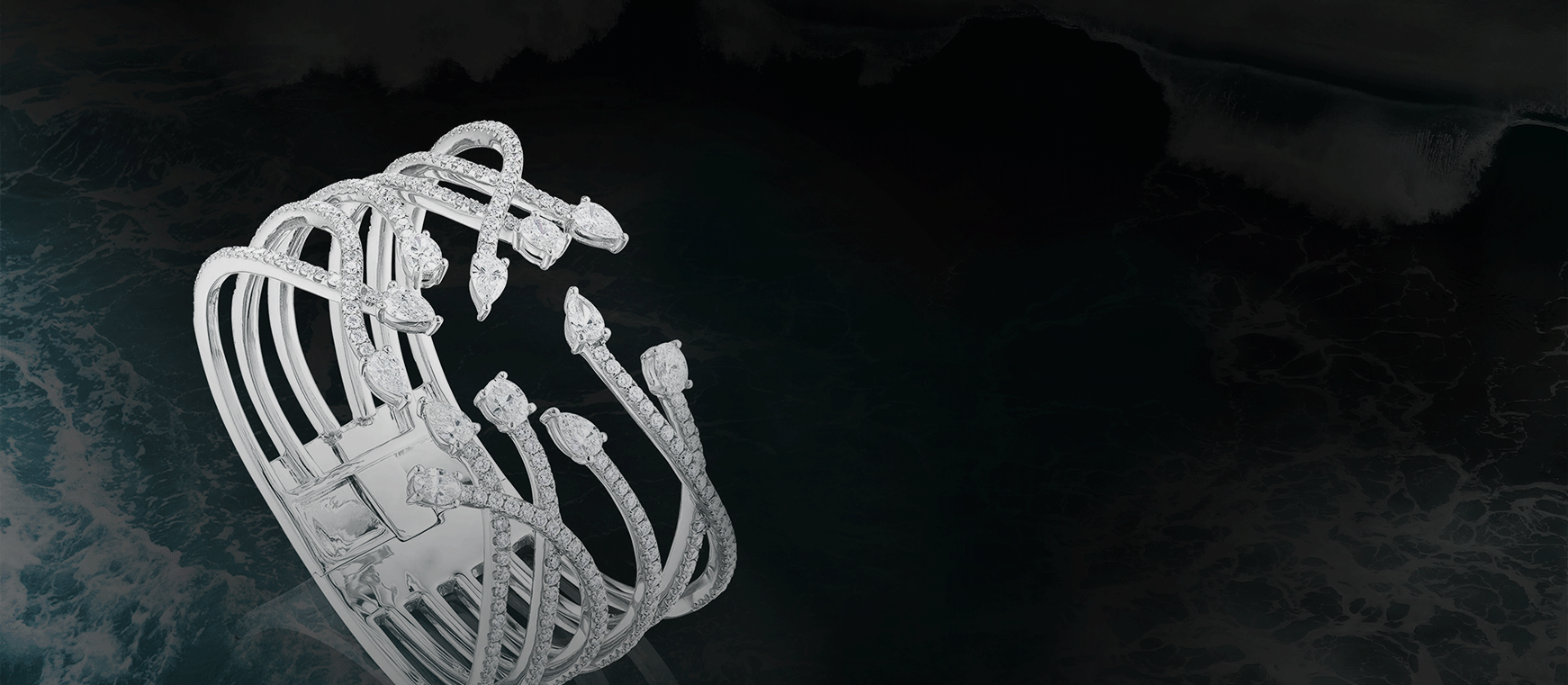Ortaea’s essence resides in Nature and she was created from a sense of wonder and admiration for the ethereal elements of nature and its preservation. Ortaea tells stories through designs that speak through form and seek to capture the deep wonders of nature. The auction piece itself is no exception, a cuff created by master craftsmen in 18kt white gold. Its unique and delicate construction is inspired by the flow of water; it cascades with rivers of diamond pave and pear shape diamonds which elegantly encase the wrist of the wearer.